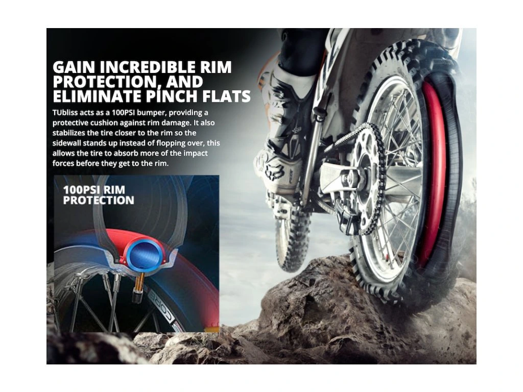 - TUbliss nahrádza konvenčné duše malou červenou vložkou 100 psi, ktorá vytvára dve rôzne tlakové zóny vo vnútri samotnej pneumatiky. To umožňuje neuveriteľných 100 psov na ochranu ráfika, zvýšenú stabilitu pneumatiky a eliminuje defekty spôsobené prerazením duše o ráfom. Vďaka tomu môžete v pneumatike voziť nízky tlak a to zvyšuje trakciu a prispieva plynulejšej jazde.