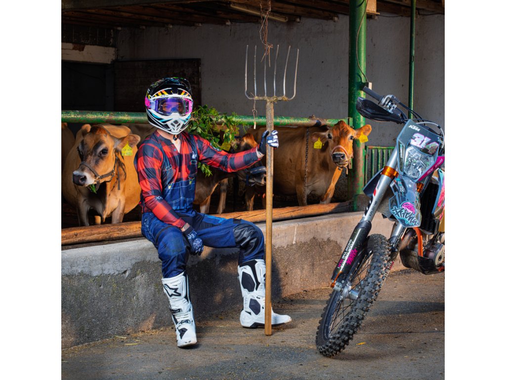 • PITCHA REDNECK – Motokrosový set pre pravý vidlákov s poriadnymi guľami! Zabudni na karbónový skafandre a sterilný líščí look, pretože „redneck“ je poctivý motokrosový úbor v dizajne džínsových lacláčov a červených flaneliek.
